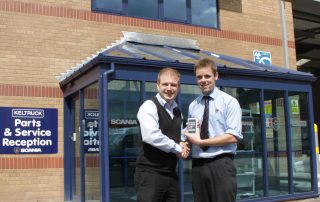 Mark Fryer (Right), Service Administrator for Keltruck Ltd – Worksop Branch receives his iPod Touch from Kris Benbow, Market Information Manager following …