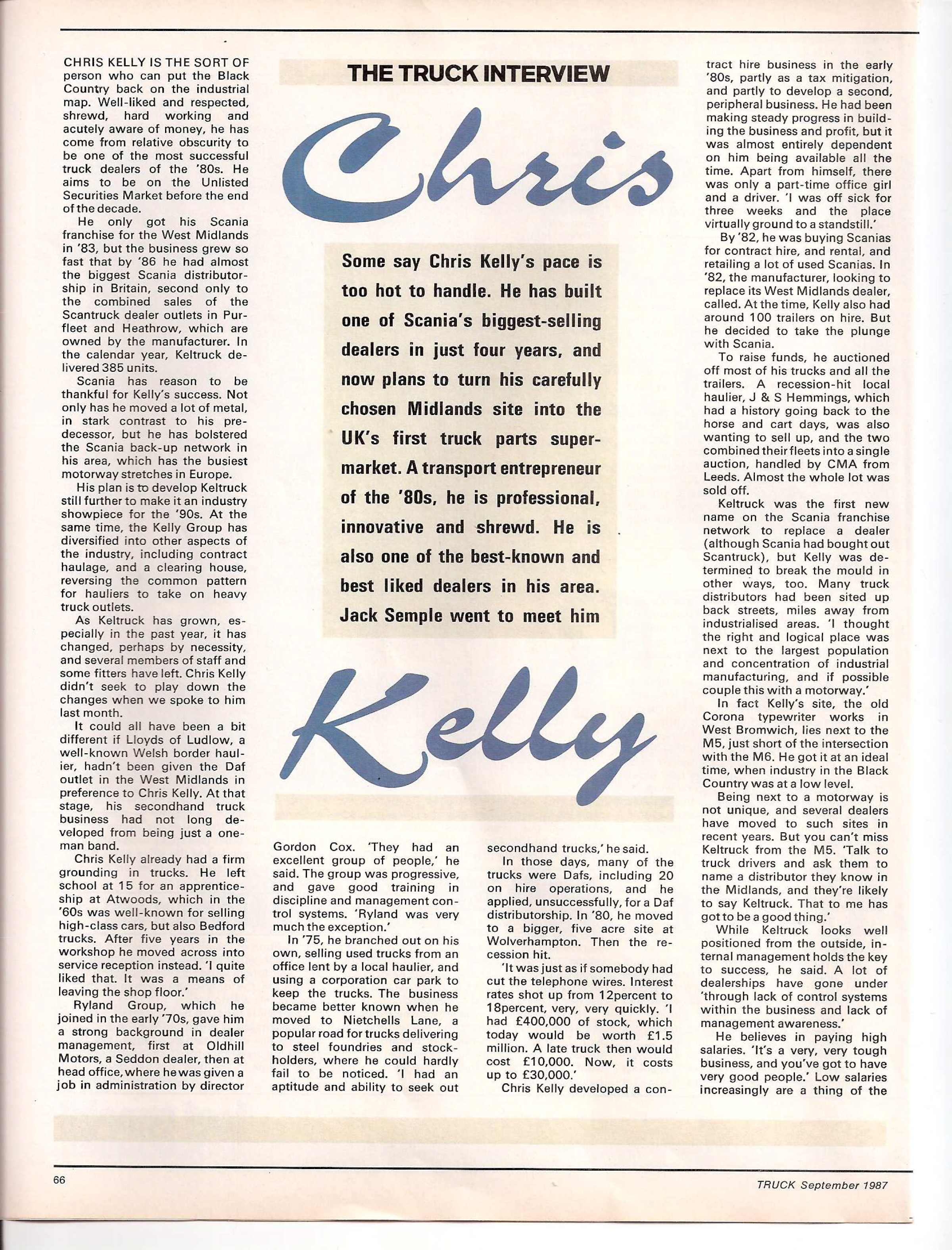 CHRIS KELLY IS THE SORT OF person who can put the Black Country back on the industrial map. Well-liked and respected, shrewd, hard working and acutely aware of money, he has come from relative obscurity to be one of the most successful truck dealers of the ’80s. He aims to be on the Unlisted Securities Market before the end of the decade.